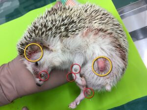 ハリネズミさんが頭部と左後肢に大きな腫瘤と同部位からの出血を主訴に来院しました。