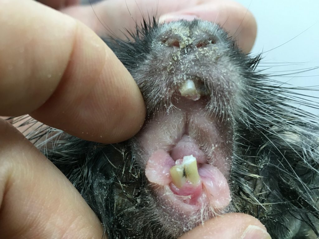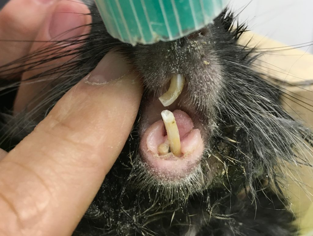 チンチラの麻酔下歯科処置 チンチラの病気 2024年4月7日 チンチラの不正咬合は比較的多くみられる病気です。食欲不振、流涎、歯ぎしり、体重減少などがみられます。上記の症状やレントゲン検査、全身麻酔下での口腔内の観察で診断をします。当院では臼歯の処置は基本的に全身麻酔下で実施しています。切歯ー処置前切歯ー処置後臼歯ー処置前臼歯ー処置後